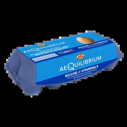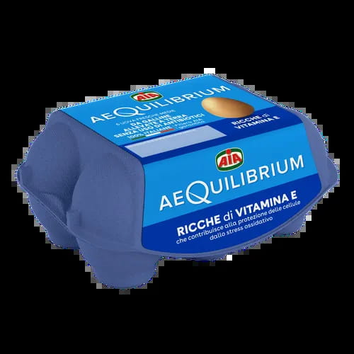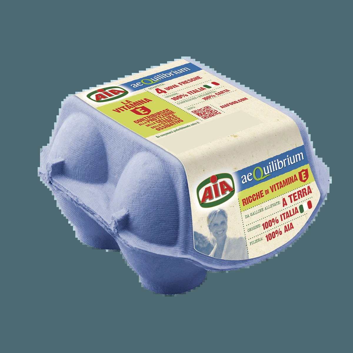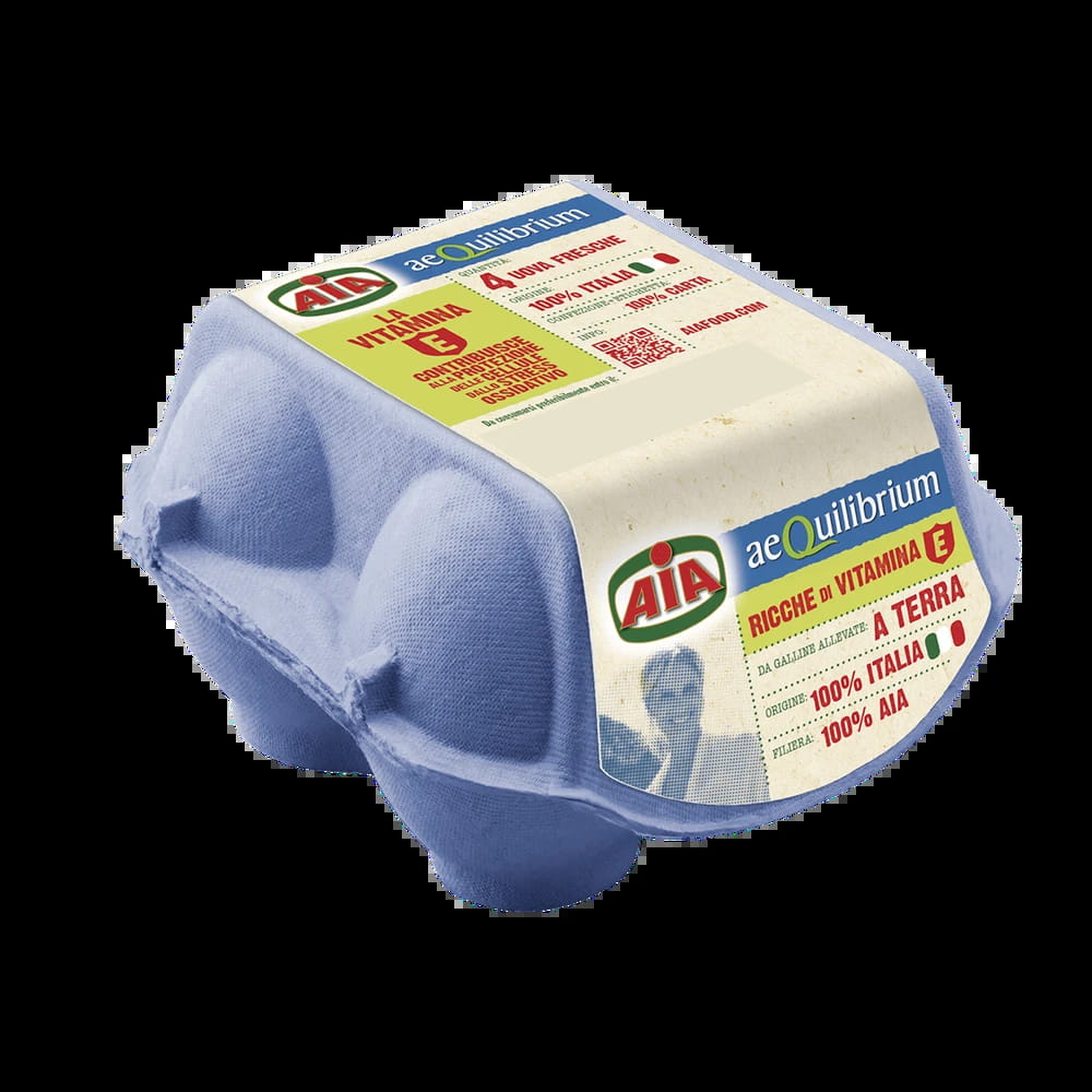 Vier AeQuilibrium-Eier von Hühnern aus Bodenhaltung und ohne den Einsatz von Antibiotika. Reich an Vitamin E, das zum Schutz der Zellen vor oxidativem Stress beiträgt.