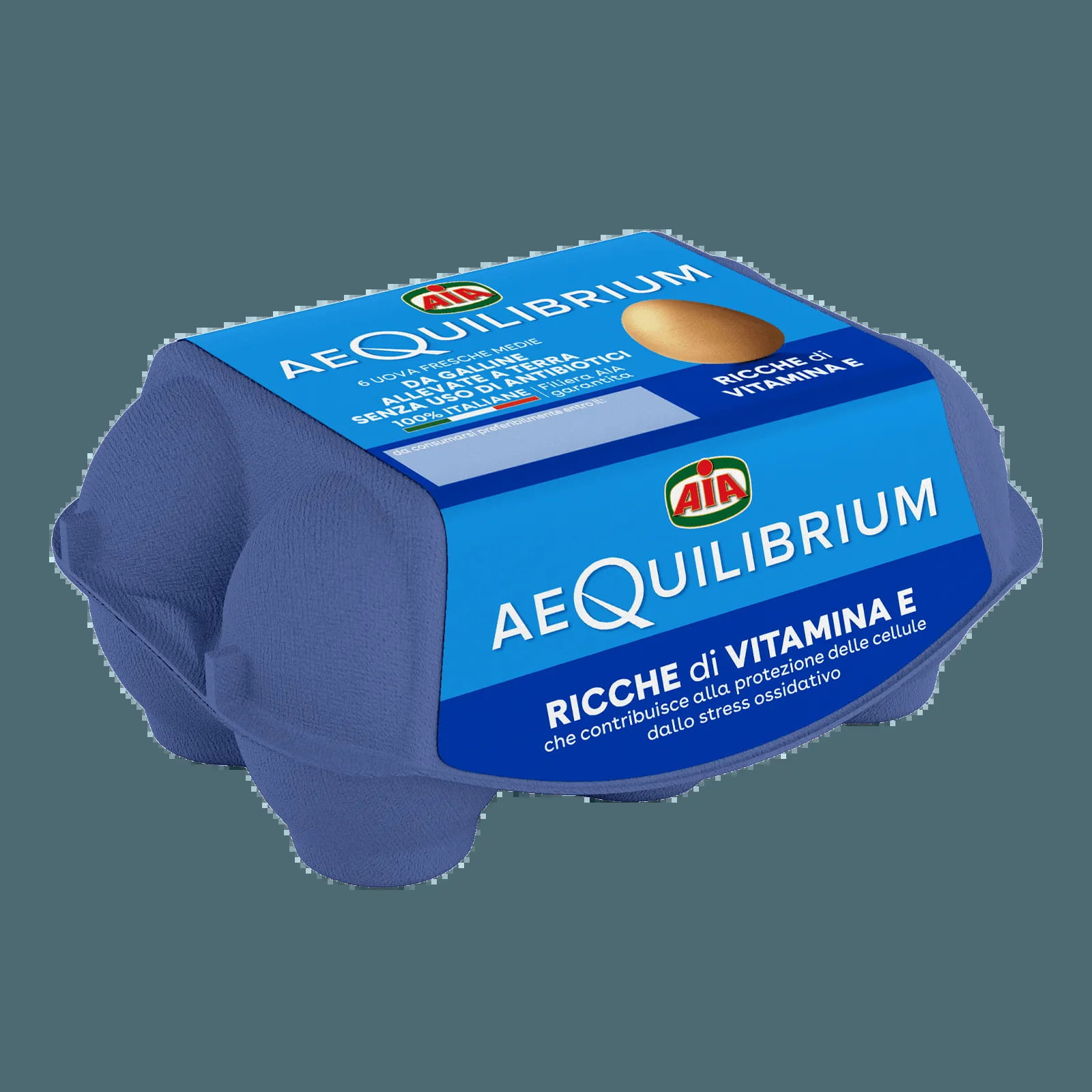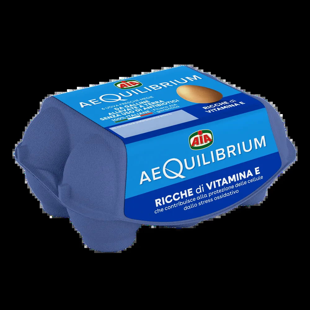 Vier AeQuilibrium-Eier von Hühnern, die auf dem Boden gehalten und ohne den Einsatz von Antibiotika aufgezogen wurden. Reich an Vitamin E, das zum Schutz der Zellen vor oxidativem Stress beiträgt.