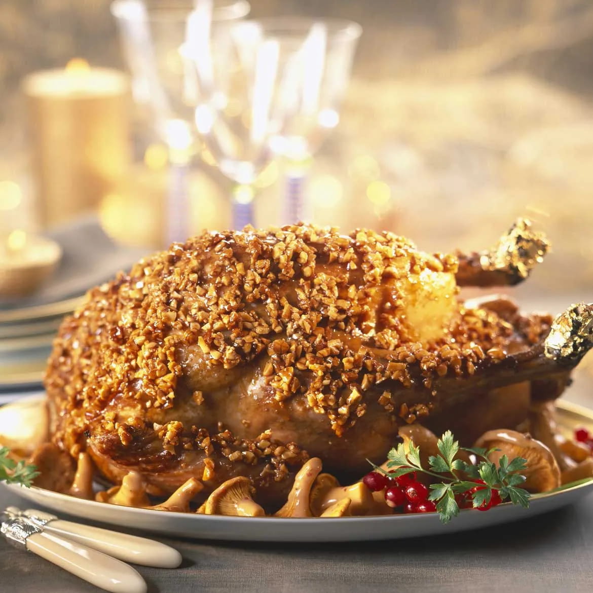 Der gebackene Kapaun mit Mandelkruste ist die richtige Mischung aus süßen und bitteren Aromen, perfekt zum Servieren mit goldbraunen und knusprigen Ofenkartoffeln.