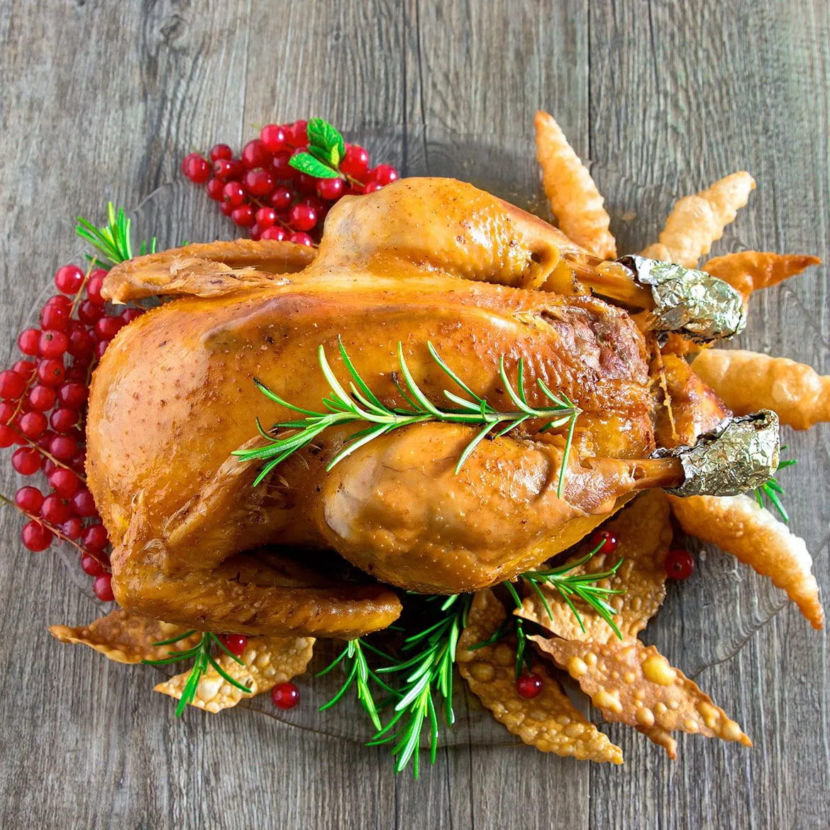 Nehmen Sie den gefüllten Kapaun aus dem Ofen und servieren Sie ihn mit den frittierten Nudeln und den drei Soßen.