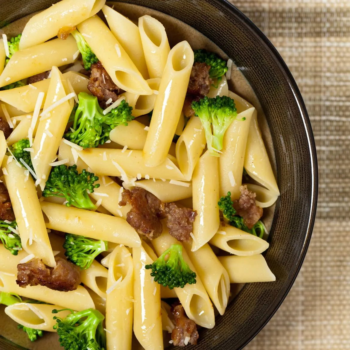 Für die perfekte Zubereitung Ihrer Penne folgen Sie unseren Tipps, wie man eine Pasta wie ein echter Chef kocht. Erhitzen Sie in einer Pfanne das extra native Olivenöl und fügen Sie den geschälten und vom Keim befreiten Knoblauch hinzu. Fügen Sie nun die Wurst hinzu und braten Sie sie gut an.