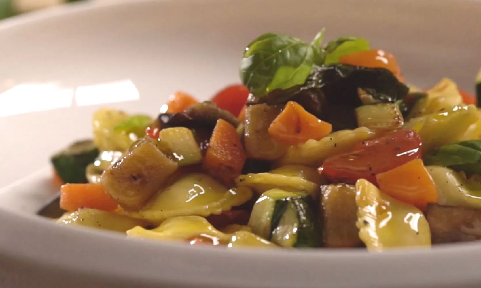 Waschen Sie das Gemüse und schneiden Sie es in Würfel. In einer großen Pfanne braten Sie die Knoblauchzehe in extra nativem Olivenöl an. Fügen Sie das Gemüse hinzu und braten Sie es an. Würzen Sie mit Salz und Pfeffer. Kochen Sie die Raviolini in reichlich kochendem Salzwasser, gießen Sie sie ab, sobald sie gekocht sind, und tauchen Sie sie in die Gemüsesauce.
