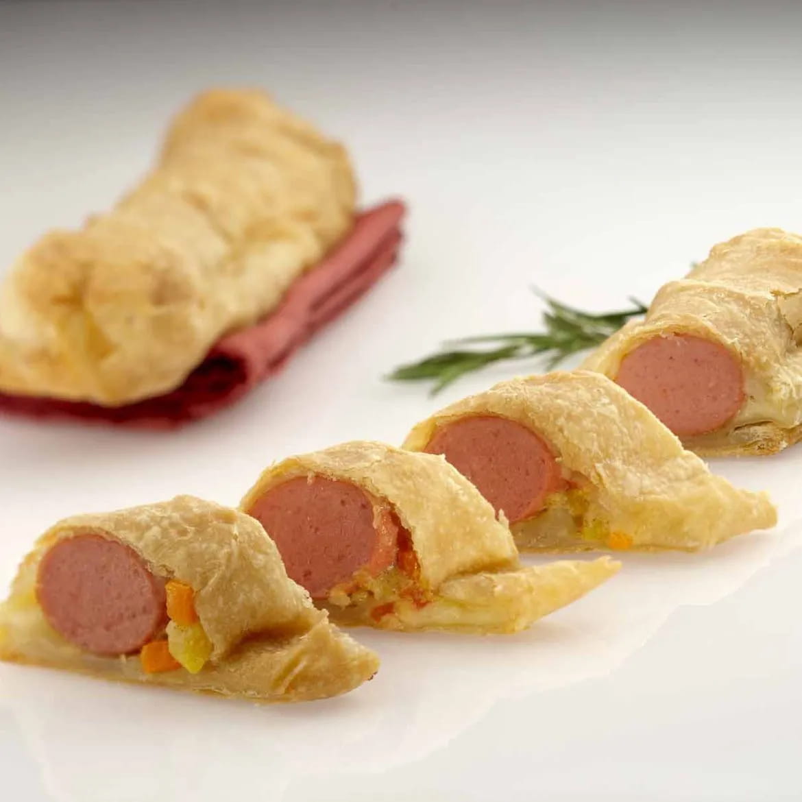 Nun können Sie den Blätterteig ausrollen und ihn in Streifen schneiden, die etwas länger als die Würstchen und etwa 10-12 Zentimeter breit sind.