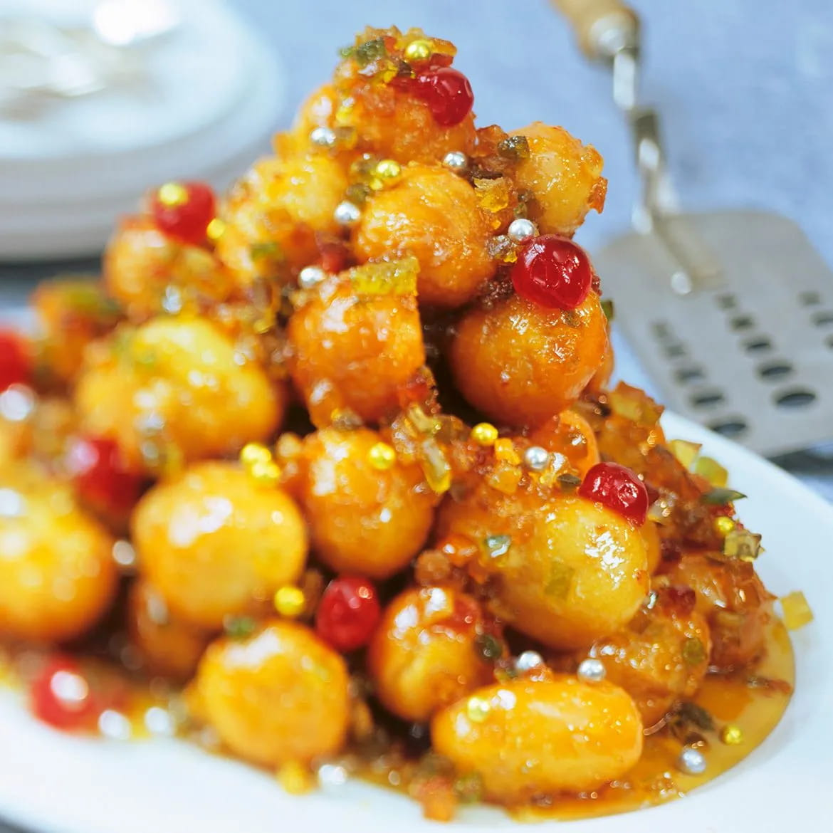 Auch wenn Sie nicht aus Neapel stammen, haben Sie sicherlich schon einmal diese köstlichen kleinen Süßigkeiten gesehen oder probiert, die während der Weihnachtszeit auftauchen. Das original neapolitanische Struffoli-Rezept besteht aus verschiedenen Schritten, ist aber recht einfach nachzumachen. Die Struffoli sind weiche und kleine Bällchen aus süßem Teig, die dann frittiert, in Honig getaucht und schließlich mit Schokoladenflocken und Zuckerstreuseln garniert werden.