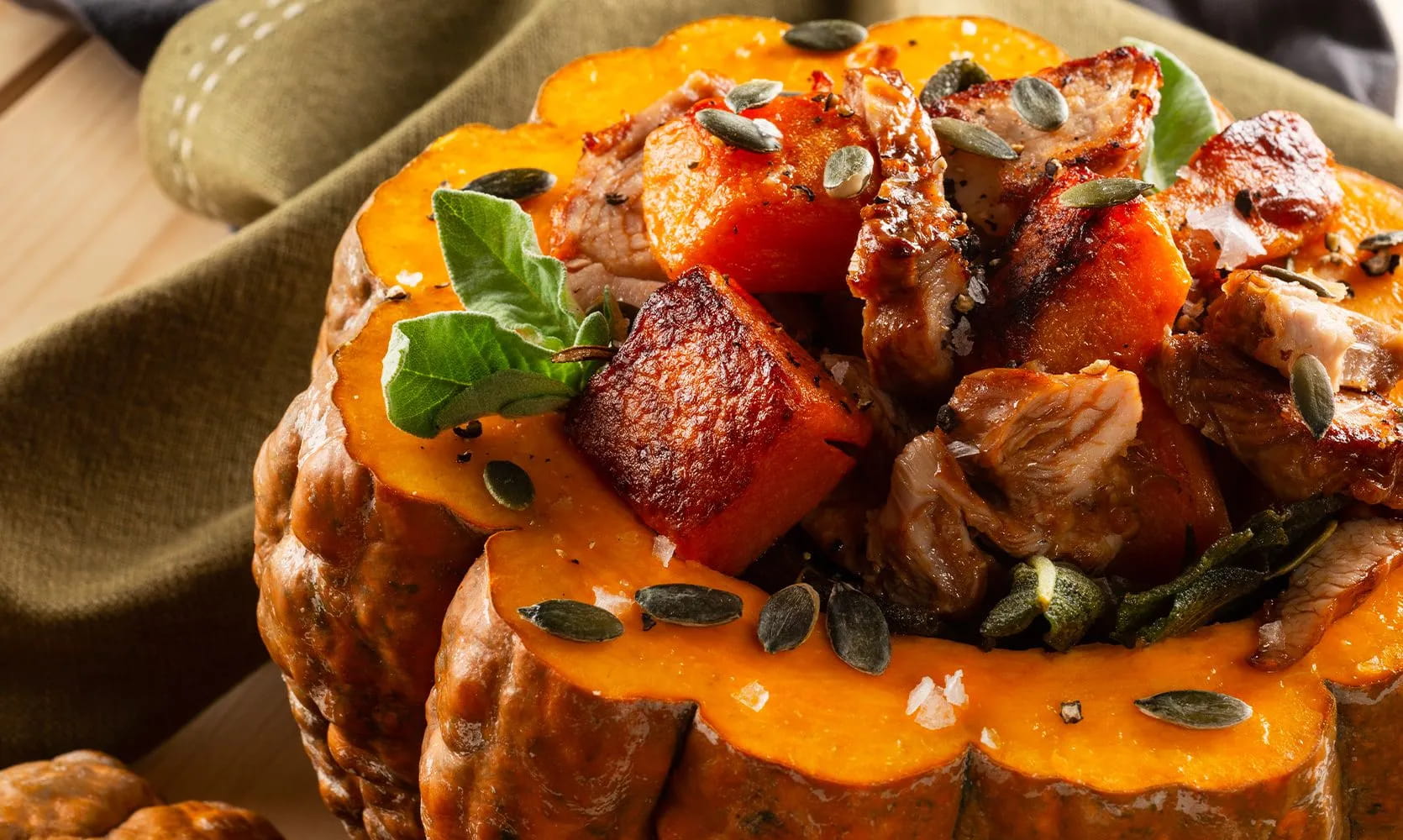 Fügen Sie den AIA Truthahnbraten hinzu, mischen Sie und servieren Sie in dem Kürbis, dekorieren Sie mit einigen Salbei und Rosmarinblättern.