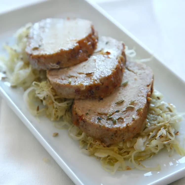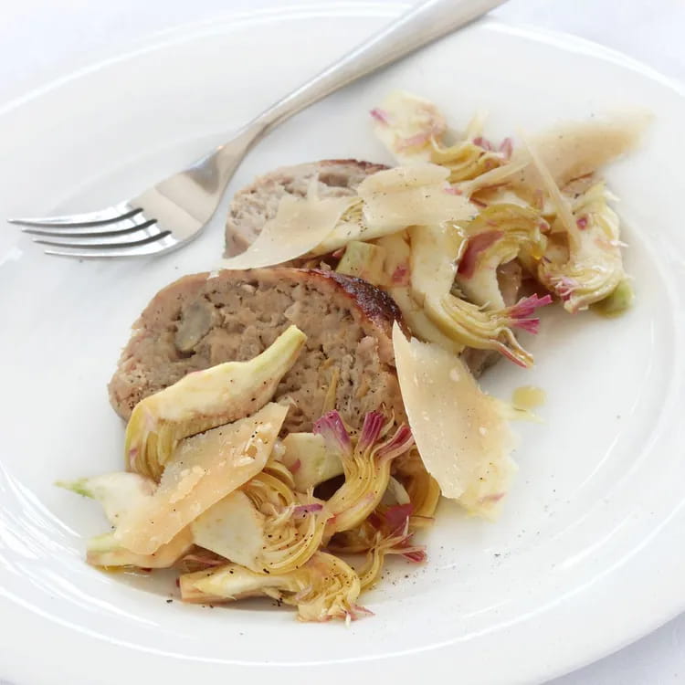 At this point transfer the meatloaf onto the puree base and slowly roll it up gently, until it is completely covered.