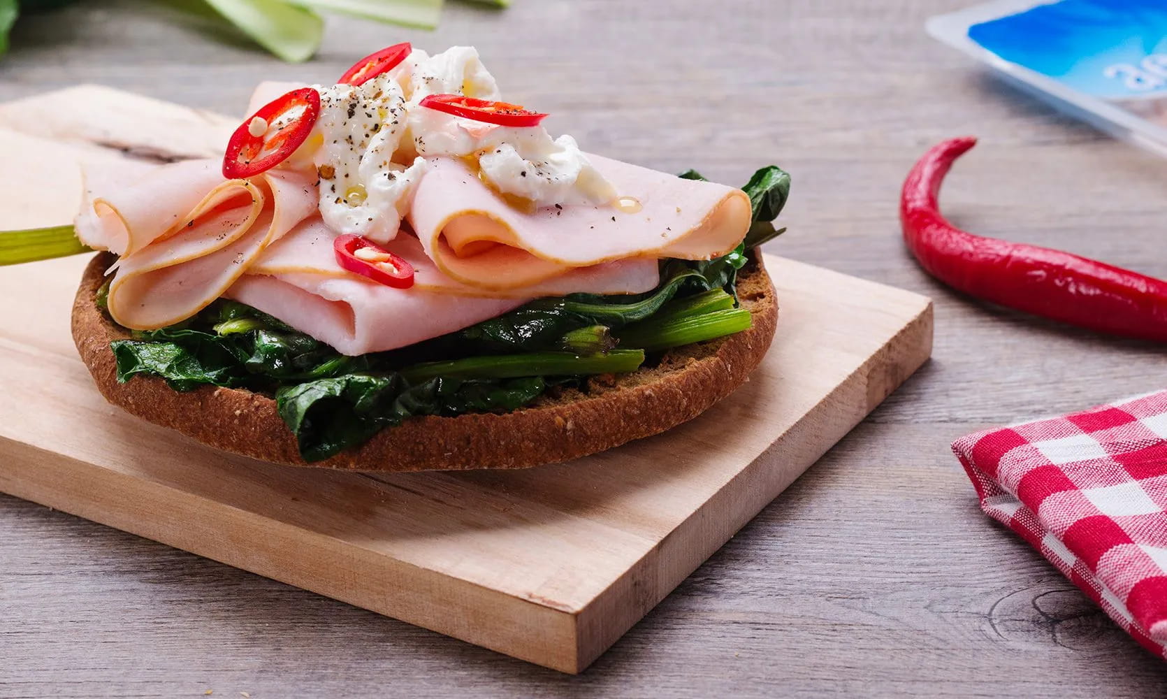 Then proceed with the plating: lay the sautéed chicory in the pan on the frisella, add 3 slices of Roasted Turkey Breast aeQuilibrium AIA, the stracciatella, thin slices of chili pepper and season with a drizzle of extra virgin olive oil, salt and pepper.