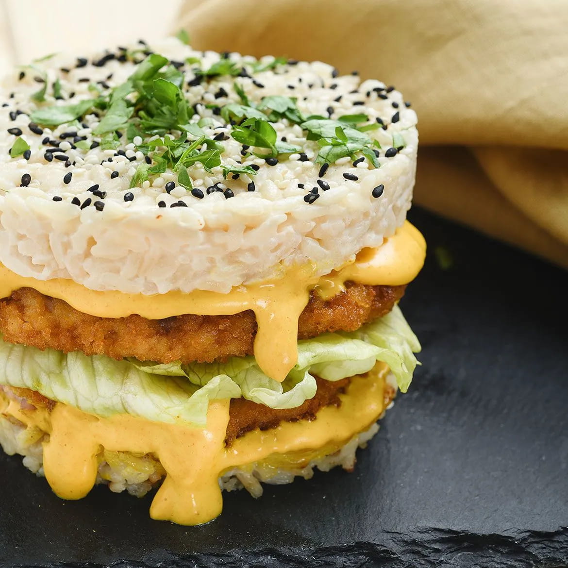 Return the saucepan to the heat and continue stirring until the sauce reaches a boil, at that point turn off the heat. Fry The Milanese until it is very crispy. Wash the salad well and dry it. With a pastry cutter, form two rice burgers. On one rice burger, place the salad, The Milanese seasoned with a pinch of salt and the sauce. Cover with the other rice burger and season on top with white sesame, black sesame, soy sauce and a sprinkle of chopped coriander.