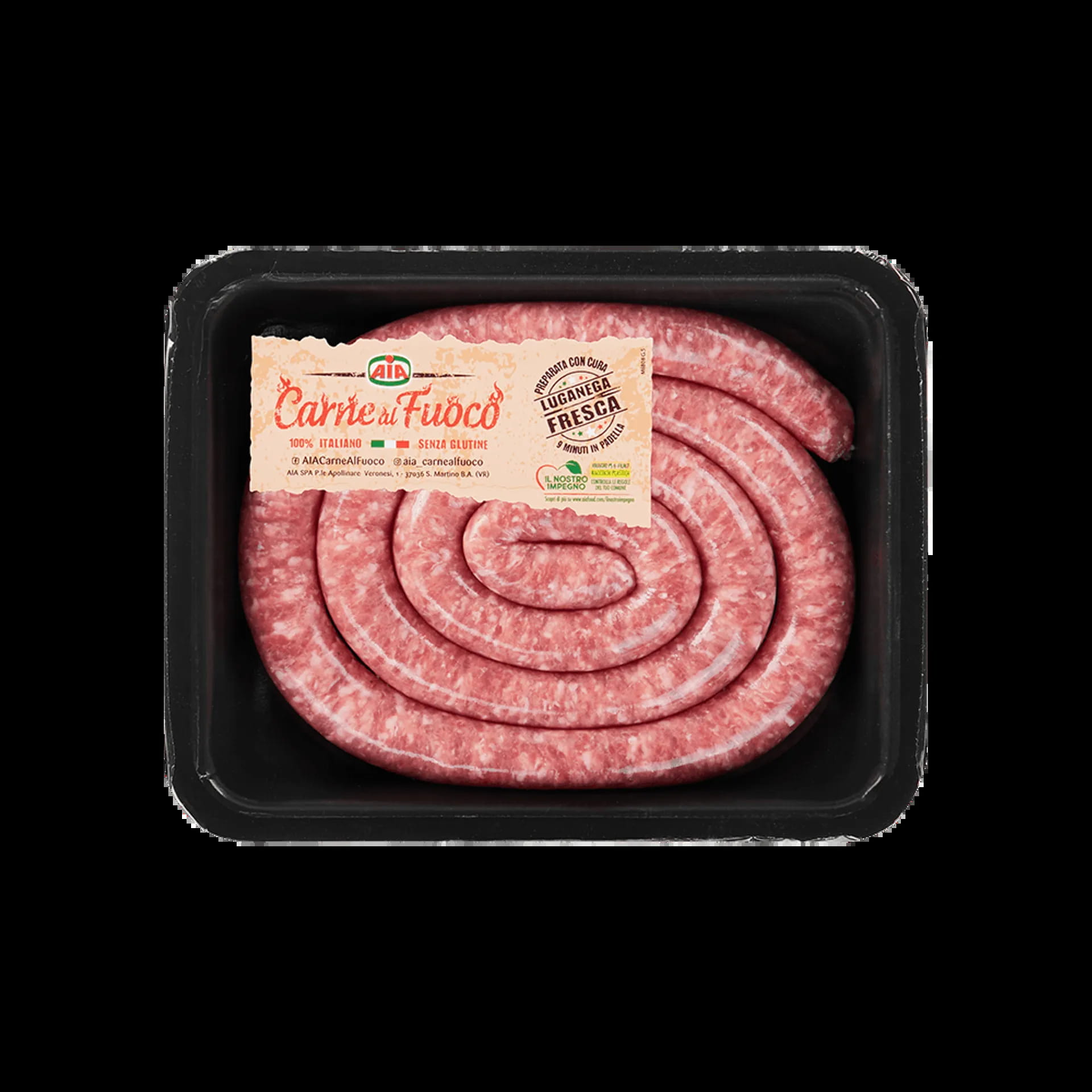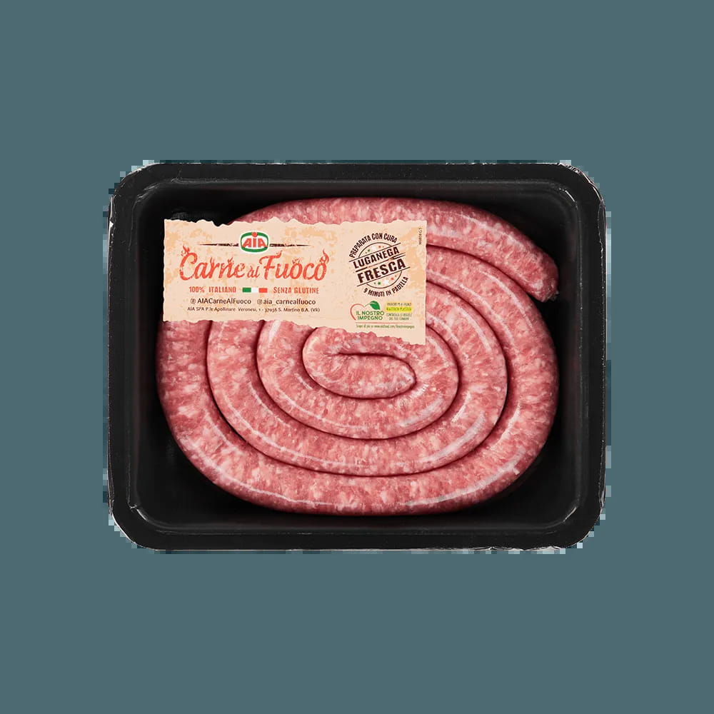 Salsiccia in formato luganega, arrotolata nel suo pratico vassoio.