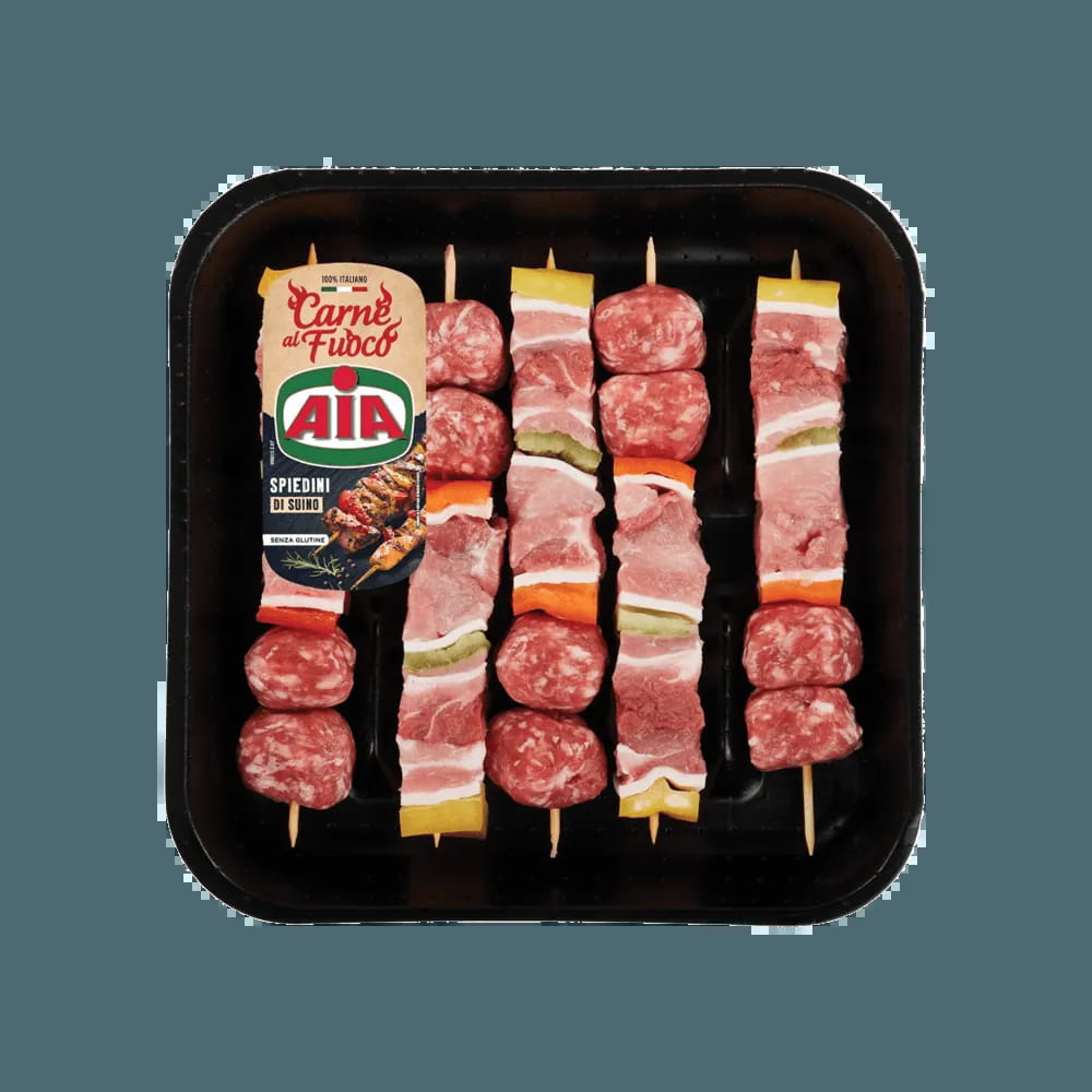 Spiedini costituiti da tagli teneri di suino, separati da peperoni e sfoglie di pancetta, accompagnati all'estremità da due chicchi di salsiccia.