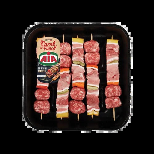 Spiedini di teneri tagli di suino, separati da peperoni e sfoglie di pancetta, accompagnati all'estremità da due chicchi di salsiccia. SENZA CONSERVANTI.