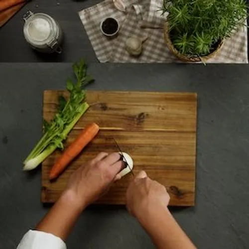 Iniziamo con la mondatura e il taglio delle verdure. Prepariamo la cipolla tagliandola finemente, mondiamo e tagliamo la carota e, infine, occupiamoci del sedano, tagliandolo a pezzetti.