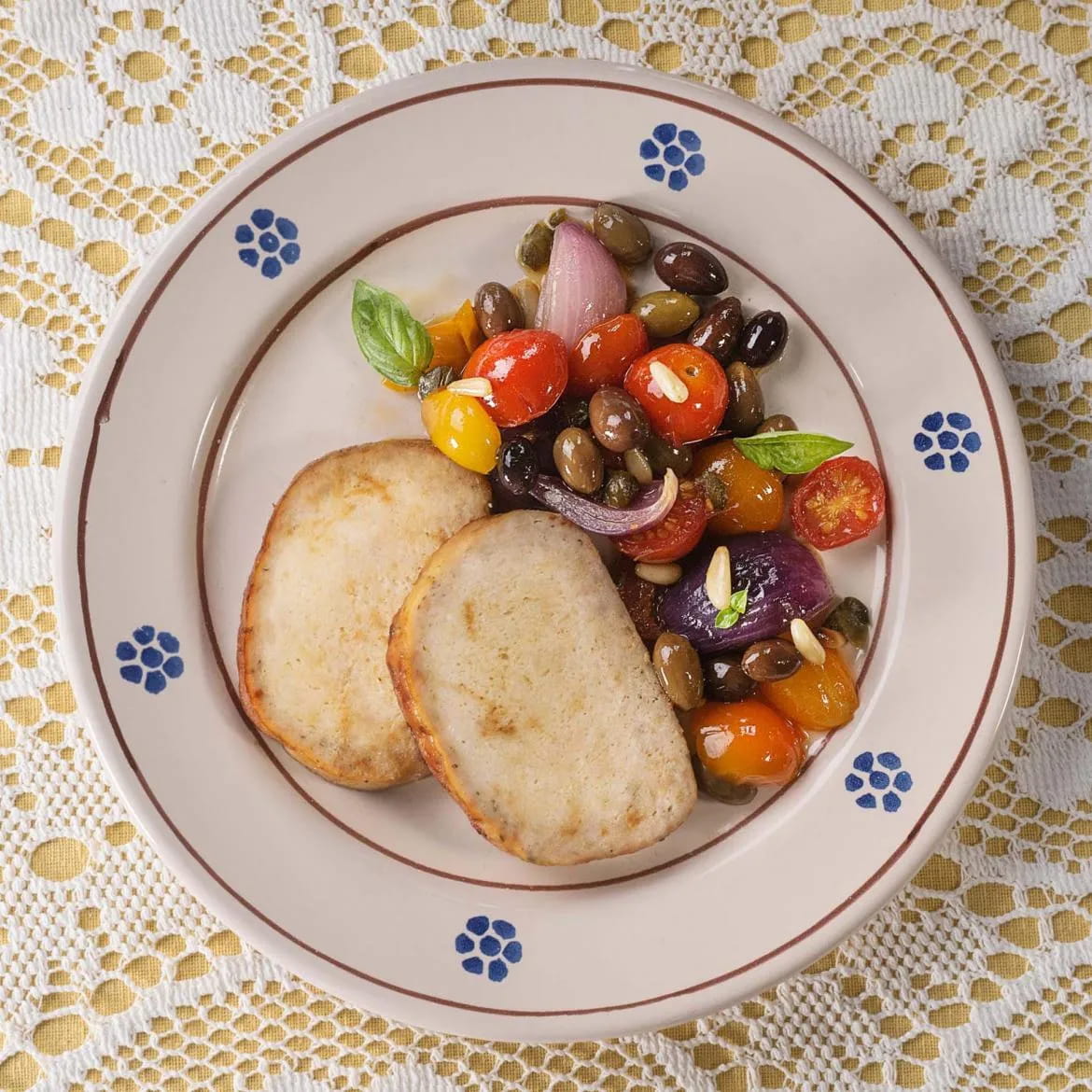 Il BonRoll Classico AIA viene servito a fette, adagiato su un letto di cipolle caramellate, olive taggiasche, pinoli tostati, capperi e pomodorini: un vero mix di gusto e sapori inediti.