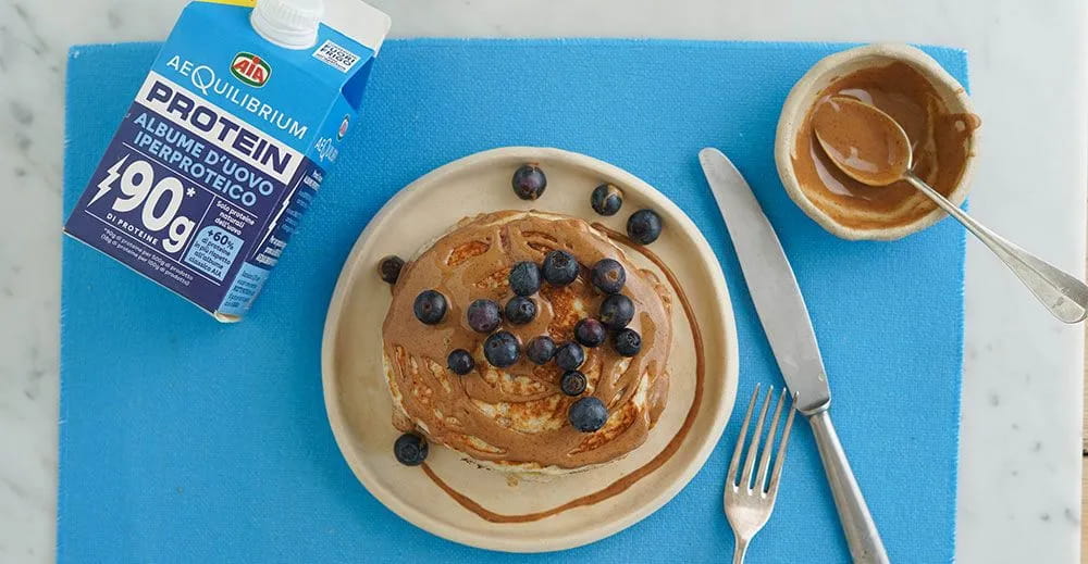 I pancake integrali proteici uniscono la fibra della farina integrale alle proteine dell'albume. Grazie allo yogurt greco, la consistenza rimane soffice, mentre i mirtilli donano freschezza a ogni morso. Questa ricetta è ideale per chi desidera una colazione sostanziosa completata dalla cremosità del burro di mandorle 100%.