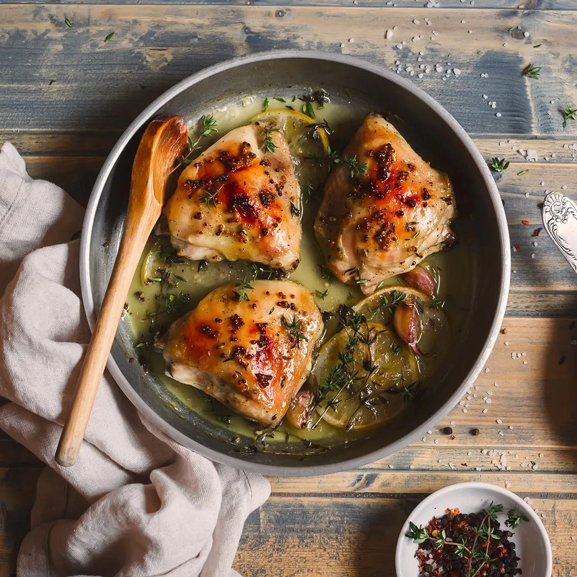 In una padella capiente inserite l’olio e fate sciogliere insieme ad esso il burro e fate rosolare a fiamma media le Sovracosce di pollo senza pelle con Osso di AIA.