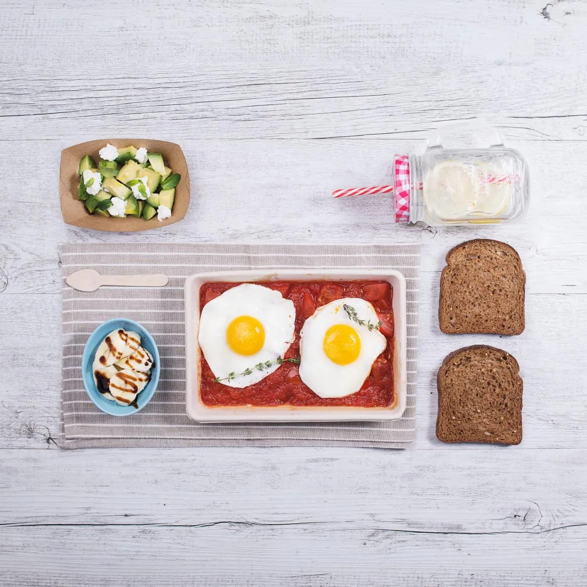 La pausa pranzo in ufficio può trasformarsi in un momento di puro piacere se preparerete questa favolosa schiscetta a base di uova al pomodoro, pane tostato, insalata di avocado, banana al cioccolato e acqua al limone. Si tratta di un pasto completo che vi farà invidiare da tutti i colleghi e che cvi darà la carica per affrontare il pomeriggio in ufficio senza tuttavia appesantirvi!
